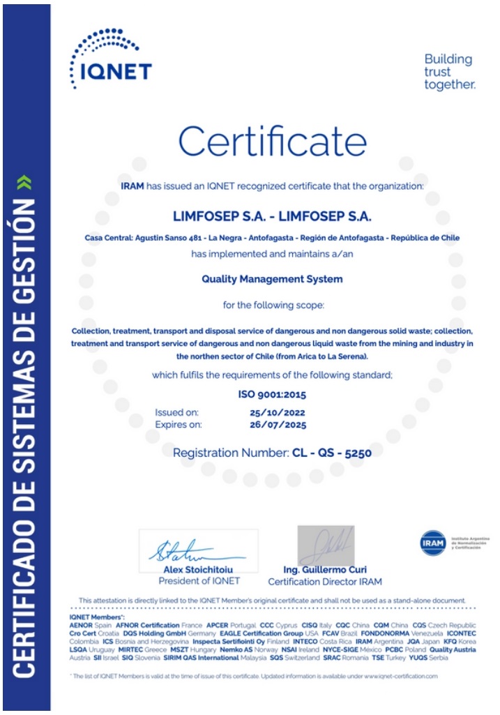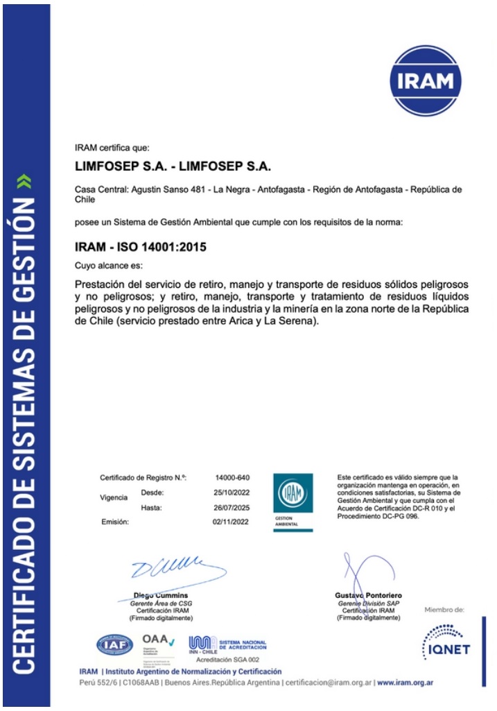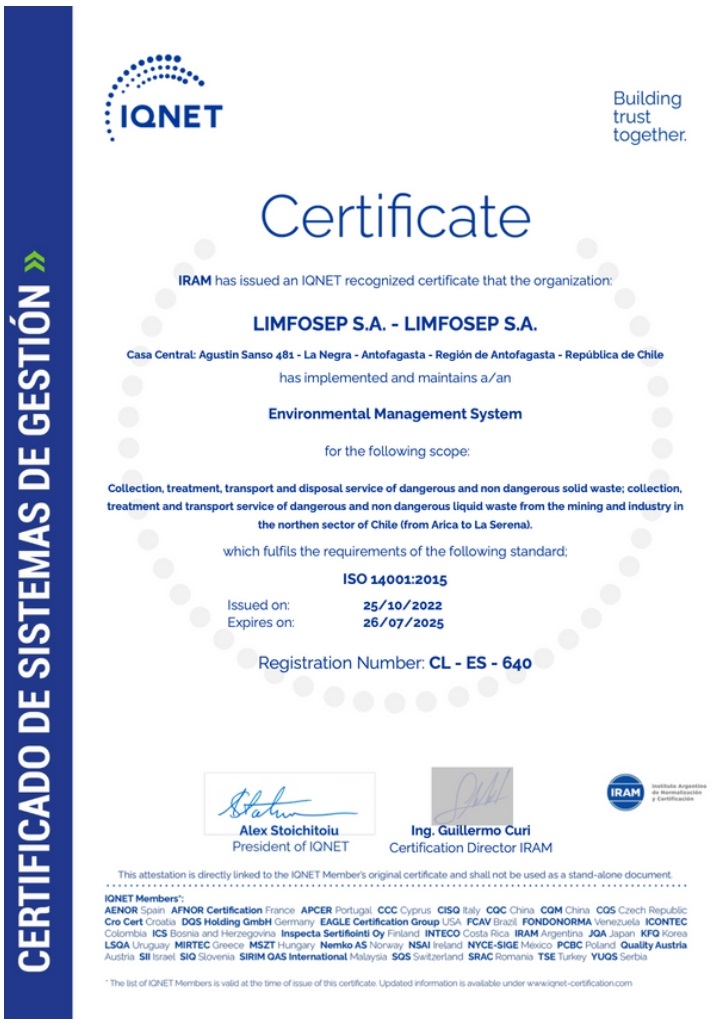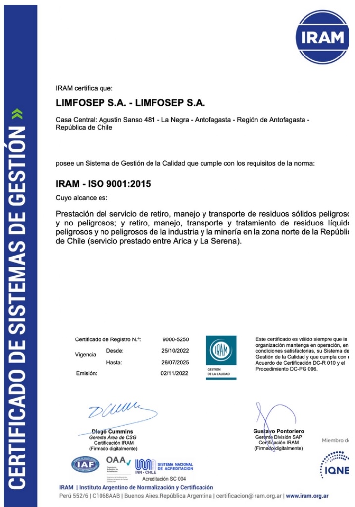 - Certificaciones ISO 9001:2015 e ISO 14001:2015
